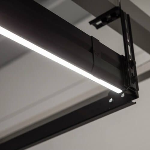 L'éclairage LED est positionné le long des deux glissières horizontales. Le mode de fonctionnement a été conçu de manière à ce que, quoi que ce soit dans un garage neuf ou un peu plus ancien, il ne soit pas nécessaire d'intervenir sur la surface des murs ou du plafond, ni de fournir une source d'alimentation supplémentaire. Les rubans LED sont logés dans des profilés en aluminium noir mat élégants, qui sont montés « à clic » à l'aide de supports flexibles spéciaux destinés aux glissières. Ce montage est non seulement élégant, mais aussi stable.